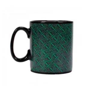 - Diseño interactivo: en frío, muestra el icónico símbolo de las Reliquias de la Muerte en blanco y negro. Al agregar líquido caliente, revela un patrón verde brillante con los pergaminos «Poder», «Anhelo» y «Humildad».